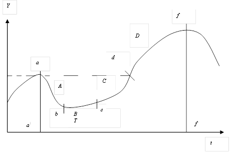 Наклонная линия А во временном отрезке а–b представляет фазу экономического кризиса; B — депрессия (b–c); C — оживление (c–d); D — подъем (d–f); Т — экономический цикл (а1–f1); Y — валовой национальный продукт; t — время.