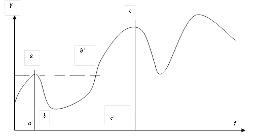 Во временном отрезке а–b наклонная линия представляет фазу сжатия; точка b — оживление; экспансия — (b–b1–c); точка с — вершина; ломанная линия а–b–b1–c — экономический цикл на временном отрезке a1–c1.