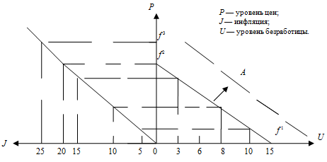 Данная модель рисунка показывает, что уровни цен и инфляции имеют прямо пропорциональную связь, тогда как последние показатели и безработица находятся в обратной зависимости. Однако при определенных условиях уровень безработицы может быть постоянным и находиться на предельной точке (f 1), что можно пронаблюдать через ломаные линии f 3–f 2–f 1 независимо от роста инфляции, как показано на рисунке. На нашем условном примере при превышении инфляции 20 % безработица останавливается на предельной точке 15 %. Эта модель представляется усовершенствованным вариантом «Кривой Филипса» и модернизированного предложения П.Самуэльсона и Р.Солоу, которые заменили ставки заработной платы на темпы прироста цен [10, c. 412].