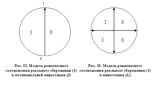 Так, взаимодействие инвестиции и сбережения можно показать в следующем виде на рисунках 32 и 33. По рисунку 32 видно, что реальное сбережение (S) может быть равно потенциальной величине инвестиций (I). При этом только сбережения могут быть источником и фактором, предопределяющим размеры инвестиций.