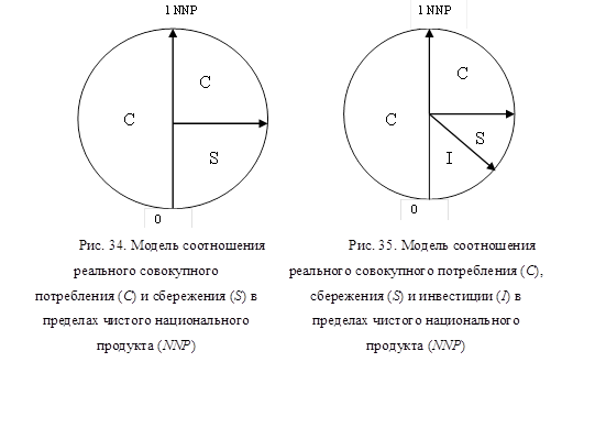По рисункам 34 и 35 можно видеть структуры чистого национального продукта. На рисунке 34 структура чистого национального продукта состоит из двух компонентов совокупного потребления (С) и сбережения (S), где часть сбережений еще не трансформирована в реальные инвестиции. Здесь видно, что потребление и сбережения непосредственно зависят от объема чистого национального продукта, при этом для совокупного потребления и сбережения функцией является чистый национальный продукт. Это можно записать в следующем виде: C = f (NNP); S = f (NNP), что и выявил еще Дж.М.Кейнс.
