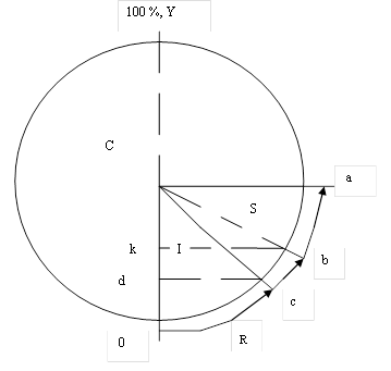 С увеличением процентной ставки (R) от точки (0) до (с) и далее (b, a) сбережения все более переходят в разряд инвестиций, что позволит увеличить потенциал будущих доходов и сократить безработицу. Однако необходимо соблюдать оптимальное соотношение между сбережениями и инвестициями, которое предопределяет объективно предельную величину процентной ставки или её оптимальную величину. Она будет определяться по следующей формуле: R = {(S + I):Y}:k, где R — объективно предельную величину процентной ставки или её оптимальную величину; Y — располагаемый совокупный доход; S — сбережения; I — инвестиции; k — коэффициент равный 2 единицам.