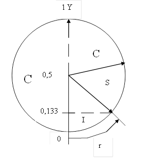 Теперь рассмотрим нашу модель в действии. Предлагается рисунок 40, где показаны реальные соотношения совокупного потребления (С), сбережения (S), инвестиции (I) и величины процентной ставки (r) в пределах валового располагаемого дохода (Y) за 2004 г. Республики Казахстан (РК).