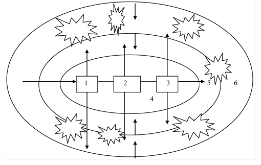 Общественное хозяйствование в процессах добычи природных ресурсов, их обработки, производства конечной и промежуточной продукции при использовании традиционной технологии производит отходы и выбросы в окружающую среду, предельная полезность которой сокращается по данной модели от окружности под номером 6 до размеров круга 5 и далее, что может вызвать не только экономический, но и экологический кризис, а затем перерасти в катастрофу планетарного масштаба. Антропогенное загрязнение биосферы вредными веществами, превышающими все нормы, не очищаются редуцентами (от лат. reducentis — возвращающий: гетеротрофные организмы, бактерии, разрушающие сложные органические соединения и высвобождающие неорганические питательные вещества). Поэтому экологи этот кризис назвали «кризисом редуцентов». При современных темпах активности загрязнения и угрозе нехватки природных и экономических ресурсов могут наступить два экологических кризиса: глобальный тепловой (термодинамический) кризис; глобальный кризис надежности экологических систем[1, c. 57].