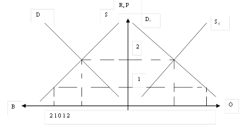 Выпуск товаров будет снижаться с пункта 2 до 1 на оси В–0 данной модели при увеличении налогов, платежей и цен от 1 до 2 по вертикальной линии 0–R, P, что обусловливает снижение объемов отходов. Конечно, при высоких темпах роста населения планеты становиться необходимостью соответственное увеличение выпуска продукции. Поэтому стоит важнейшая задача перехода на малоотходное и безотходное производство, высокопроизводительную технологию.