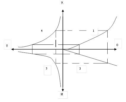 Рис. 46. Модель взаимосвязи уровня развития технологии (Т), ущерба от отходов (Уо), объема роста отходов (О) и издержек производства (И). (Цифры 1, 2, 3, 4 означают сектора кривых или прямых линий взаимосвязи показателей координат)