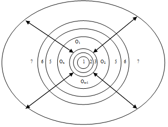 Рис. 47. Модель структуры ноосферы и социальной экономики: 1 — наука; 2 — образование; 3 — здравоохранение; 4 — О1–Оn — отрасли экономики; 5 — инновационная экономика; 6 — социальная экономика; 7 — ноосфера