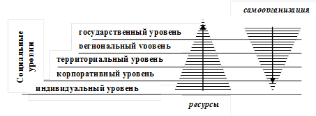 Здесь очень хорошо видна двойственность интерпретаций. Если говорить о самоорганизации, то внешней средой является государство (верхние уровни), которым снизу делегированы управленческие полномочия. Если же говорить о ресурсных потоках – в качестве внешней среды выступают носители интересов низших уровней.