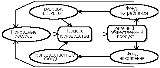 Общая системотехническая модель производственного процесса показана на рис.2. Место производственного процесса в общей схеме воспроизводства отражено на рис.3.