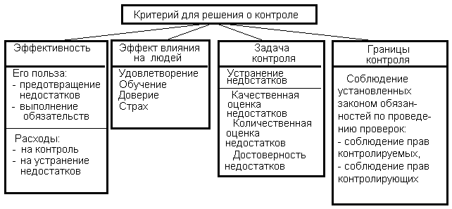 Для принятия решения о контроле и организации процессов контроля могут иметь значение ряд критериев: его эффективность, эффект влияния на людей, задачи контроля и его границы (рис. 39).