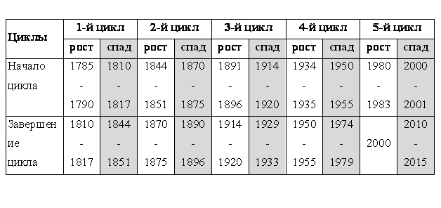 Одной из важнейших проблем современной экономической теории является проблема периодизации экономических циклов. В качестве примера можно привести споры относительно выделения технологий, претендующих на роль движущей силы пятого цикла Кондратьева [53, с. 17]. При этом многие авторы признают, что рамки применения таких технологий далеко не всегда соответствуют нормативным показателям длительности цикла [145, с. 69].
