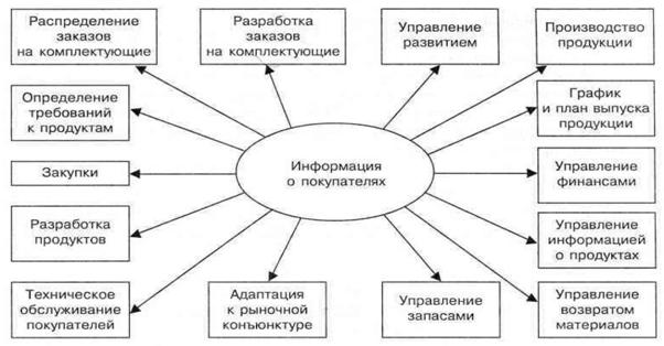Как видно из представленной схемы, информация о покупках является в CSRP-системах отправной точкой принятия всего спектра управленческих решений в цепочке производства и движения товаров. На её основе осуществляется не только управление, но и планирование производственной деятельности предприятия.