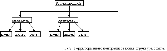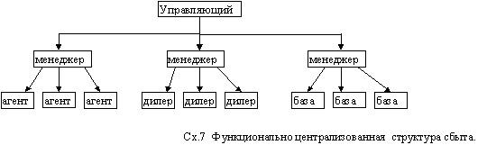 Распространенная малоэффективная структура сбыта, при которой деятельность агентов осуществляется по собственной схеме, а создание и обслуживание дилеров есть функция специальных менеджеров, показана на Сх.7.