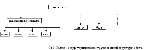 Логика развития сбыта производственного или крупнооптового торгового предприятия предусматривает охват в первую очередь крупных покупателей, затем средних, и наконец мелких. Структура предприятия эволюционирует, сначала делая упор на создании агентской сети, а затем - дилерской и сети собственных филиалов. Взаимодействие агента, дилера и собственного филиала носит конкурентный характер, т.к. их деятельность направлена на одну и ту же территорию. Поэтому она должна организовываться особенно тщательно, находя отражение в управленческой структуре сбыта.