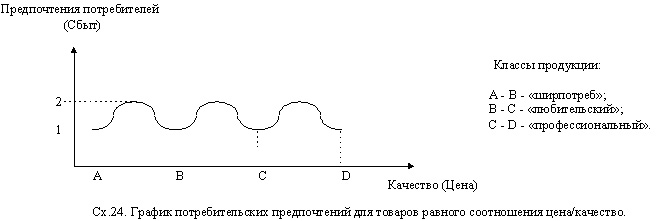 При равном соотношении цена/качество для различных марок одного товара график потребительских предпочтений никогда не является линейным. Потребитель относит все многообразие продукции к ограниченному количеству классов, чаще всего к трем классам: “ширпотреб” (низший), “любительский” (средний), “профессиональный” (престижный). При возникновении потребности покупка совершается в определенном классе товаров. Например, фотоаппарат для сына-второклассника может быть куплен в классе “ширпотреба”; для нужд семьи - в “любительском”; для работы или хобби - в “профессиональном”.