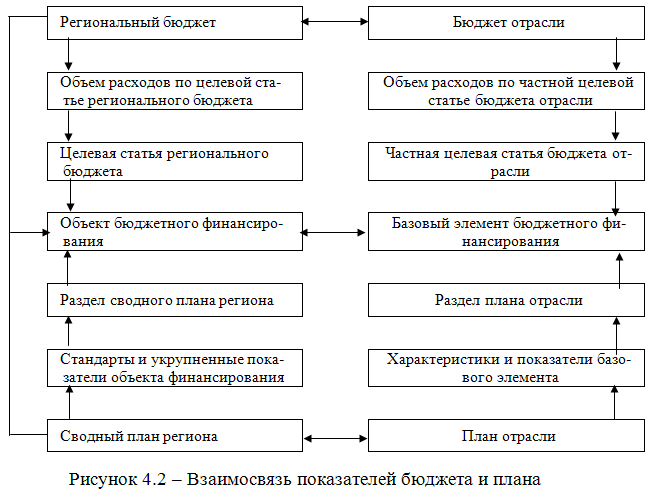 В методическом аспекте прежде всего важно обеспечить взаимосвязь бюджета и плана. Это достигается совпадением объектов планирования и бюджетного финансирования. Основные зависимости, возникающие при этом, представлены на рисунке 4.2.