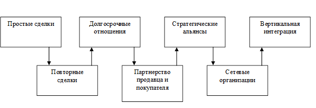 Наиболее интересна в контексте настоящего разговора модель взаимодействия, трансформирующая общий сетевой подход к управлению. Сетевой подход означает наступление качественно новой фазы в эволюции рыночной системы управления. Он основан на гипотезе, согласно которой любой субъект на определенном этапе развития рынка уже не может функционировать полностью независимо. Он вынужден согласовывать стратегию деятельности с партнерами по сети, устанавливать длительные деловые контакты, адаптироваться к динамике отношений обмена. Эту динамику иллюстрирует, в частности, схема, представленная на рис. 2.1., заимствованная из работы Ф. Вебстера.