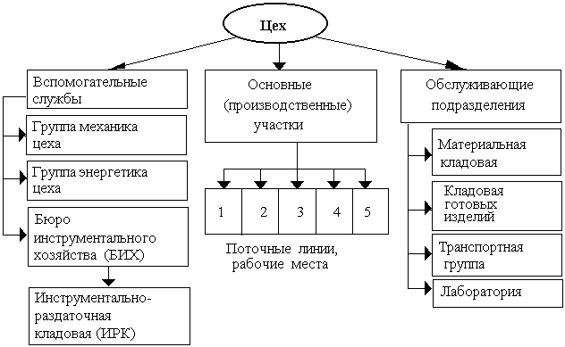 В цехах (подразделениях) основного производства предметы труда превращаются в готовую продукцию. Цехи (подразделения) вспомогательного производства обеспечивают условия для функционирования основного производства (инструменты, энергия, ремонт оборудования). Подразделения обслуживающего производства обеспечивают основное и вспомогательное производства транспортом, складами (хранение), техническим контролем и т.д.