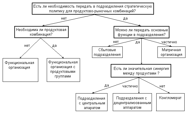 Организация с системой подразделений (иногда они называются стратегическими предпринимательским единицами (бизнес-единицами) может иметь или продуктовую, или рыночную ориентацию. Если она является чисто продуктовой организацией, то ее подразделения составлены по продуктовому признаку, каждое из которых отвечает за определенную группу продуктов безотносительно к рынку, на котором эти продукты продаются. В рыночной организации подразделения ориентированы на рынок (например потребительский, промышленный), т. е. в сферу их деятельности включены все продукты, предназначенные для специфических групп потребителей.
