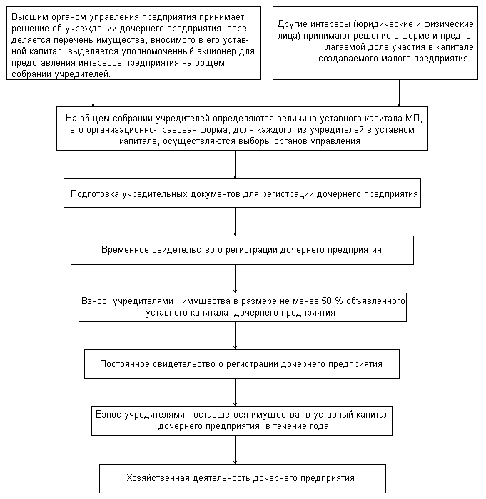Согласно Гражданскому Кодексу РФ, "Хозяйственное общество признается дочерним, если другое (основное) {в нашей случае - реструктуризируемое} хозяйственное общество или товарищество в силу преобладающего участия в его уставном капитале, либо в соответствии с заключенным между ними договором, либо иным образом имеет возможность определять решения, принимаемые таким обществом. Дочернее общество не отвечает по долгам основного общества. На приводимой ниже схеме показана процедура учреждения дочернего предприятия в "общем" виде (см. рис. 33).