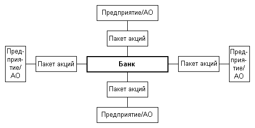 Ко второму типу относятся группы, где центром собственности является кредитно-финансовое учреждение, обычно коммерческий банк (рис. 41). Как держатель контрольных пакетов акций банк ничем не отличается от обычной холдинговой компании. Как правило, в структуре банка имеется управление холдинга, которое непосредственно выполняет функции центра управления собственностью. На этой основе