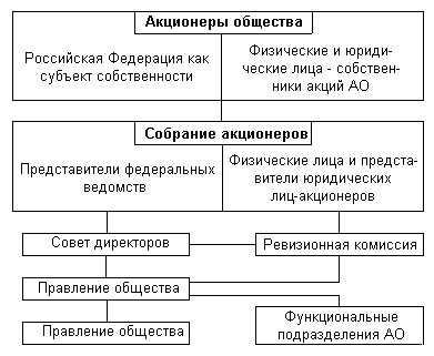 К третьему типу принадлежат группы, где участники объединили свои капиталы и создали единую акционерную компанию (рис 42).Подобная компания практически не отличается от обычной корпоративной структуры, где кроме производственных функциональных подразделений имеются банковские учреждения, научно-исследовательские центры и т.д. К числу таких объединений можно отнести недавно образованную гигантскую компанию "Российская металлургия". Управление собственностью осуществляется через сложное взаимодействие собрания акционеров, правления, аппарата, ревизионной комиссии и т.д. (рис 43).