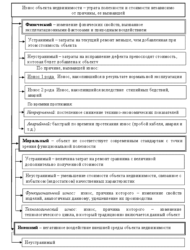 Продолжительность физического срока жизни объекта недвижимости (кроме земли), экономический и эффективный возраст зависят от износа – процесса, имеющего силу законов природы. Существуют три вида износа: физический, моральный и внешний (экономический) (рис. 1.6).