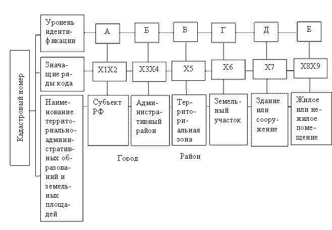 Кадастровый номер строений или других объектов недвижимости строится на основе кадастрового номера земельного участка с дополнением номера объекта на земельном участке. Кадастровый номер имеет иерархическую структуру (рис. 2.1) – от номера субъекта Российской Федерации до номера конкретного объекта недвижимости А : Б : В : Г : Д : Е, где А – номер субъекта РФ, определяемый Комитетом РФ по земельным ресурсам и землеустройству; Б – номер административно-территориального образования, входящего в состав субъекта РФ, определяемый органом исполнительной власти данного субъекта; В – номер зоны (микрорайона, квартала, иной учетной единицы), утвержденный органом местного самоуправления; Г – номер земельного участка, присваиваемый исходя из существующего порядка учета земельных участков; Д – номер здания или сооружения, определяемый в соответствии с порядком их учета; Е – номер жилого или нежилого помещения, присваиваемый в соответствии с существующим порядком их учета; ¸ – разделитель составных частей кадастрового номера.