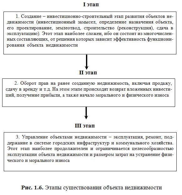 Жизненный цикл объектов недвижимости как собственности, с точки зрения владельца, повторяется многократно с каждым новым владельцем вплоть до окончания срока экономической или физической жизни объекта недвижимости. Исходя из триединства категорий — материальной (физической), правовой (юридической) и экономической жизненный цикл объекта недвижимости можно разделить на три этапа (рис. 1.6).