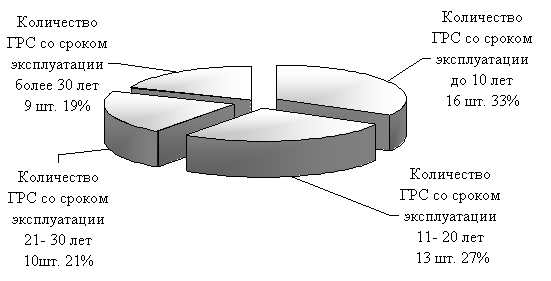 Возрастная структура всех газораспределительных систем, эксплуатируемых ООО «Тюментрансгаз», приведена на диаграмме рисунке 3.2.