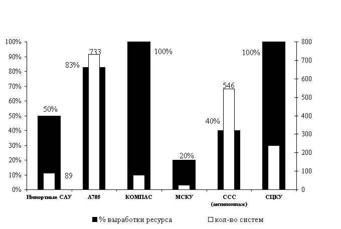 Рис. 3.3 Количество систем автоматизированного управления газоперекачивающими агрегатами по основным типам и процент выработки ресурса