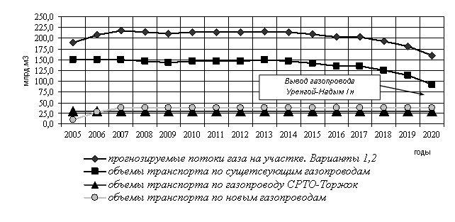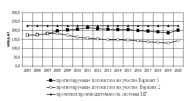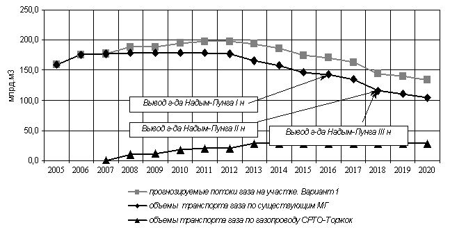 По первому варианту уровень загрузки магистрального газопровода Ямбург-Центр предоставляет ограниченные возможности по перераспределению газа из перегруженного «надымского» коридора. В связи с этим потоки газа на участке в период до 2012 года значительно превысят производительность существующих газопроводов. Снижение объемов транспорта газа, начиная с 2012 года, позволит уменьшить нагрузку на существующие газопроводы, а с 2016 г. начать вывод ниток из эксплуатации.