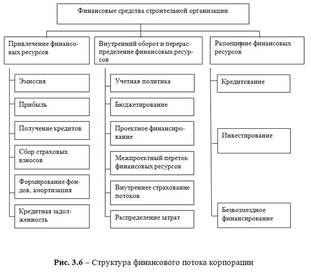 Объем финансирования на реконструкцию объектов имущественного комплекса по транспорту газа может быть представлен в виде имеющего определенную продолжительность процесса, включающего процедуры привлечения, внутреннего оборота и перераспределения, а также размещения финансовых ресурсов (денежных средств). С учетом необходимости реконструкции объектов имущественного комплекса по транспорту газа в связи с ростом объемов добычи природного газа и планов ремонтов возникает острая необходимость расчета объемов финансирования на перспективу. Финансовые средства строительной организации могут быть как собственные, так и привлеченные. Структура финансового потока представлена на рисунке 3.6.