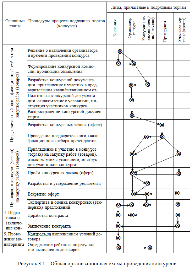 Общая организационная схема проведения конкурсов, регламентированная законом «О конкурсах на размещение заказов на поставки товаров, выполнение работ, оказание услуг для государственных нужд» от 6 мая 1999г. N 97-ФЗ и приказом «Об утверждении методических рекомендаций по проведению торгов (конкурса) на закупку товаров (работ), квалификационному отбору поставщиков (подрядчиков) - (конкурсной документации)» от 30 сентября 1997 г. N 117, представлена на рисунке 3.1 Такая схема рекомендована экспертами мирового банка.