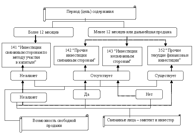 Основными критериями отнесения стоимости финансовых инвестиций в Украине на тот или иной счет являются срок и цель содержания, возможность свободной продажи, связанность эмитента и инвестора (Рис. 3.6).