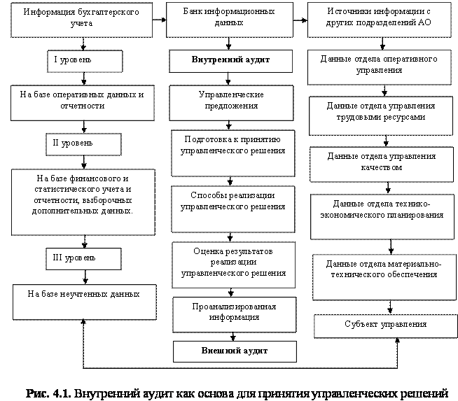 Схема информационного обеспечения внутреннего аудита, предусматривающая концентрацию в банке данных учетной информации и информации прочих подразделений акционерного общества, влияющей на достоверность аудиторских выводов и, соответственно, на правильность принятия управленческих решений, представлена на Рис. 4.1.