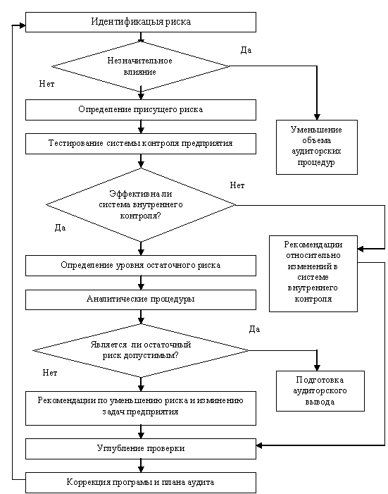 Оценка рисков во внутреннем аудите является беспрерывным процессом, который длится на протяжении всего процесса аудита и осуществляется поэтапно: идентификация рисков, оценка значения рисков и определение временных рамок его существования, определение присущих рисков, оценка эффективности системы контроля предприятия, направленная на уменьшение риска, ее действенность, оценка степени остаточного риска, т.е. присущего риска, не охваченного системой контроля. На Рис. 4.6 предложен алгоритм оценки риска и его корректирования в процессе осуществления внутреннего аудита, в том числе и аудита ценных бумаг.