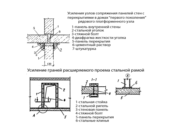 Дополнительных мероприятий требует принимаемое в проектах реконструкции устройство новых или ликвидация имеющихся проемов в несущих стенах. После расчета несущей способности сечений простенков, остающихся после устройства новых проемов, они (при необходимости) должны быть усилены, например, установкой несущих стальных рам по контуру новых проемов. При этом должна соблюдаться следующая последовательность операций: установленные по обе стороны стены стальные профили обрамления должны быть объединены натяжными болтами через просверленные в панели отверстия, после чего удаляют бетон по месту нового проема и оштукатуривают грани нового проема, включая его стальное обрамление. Последовательность выполнения работ по устройству новых проемов – «сверху-вниз» – начиная с верхнего этажа и кончая первым.