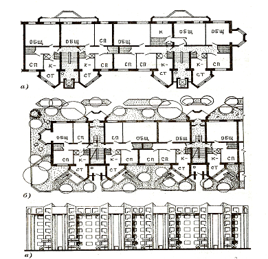 Если ранее двухквартирные секции с большим числом комнат старались разъединить на три- четыре квартиры, то теперь в новых экономических условиях квартиры, наоборот, укрупняют вплоть до организации на этаже одной квартиры (Рис.5. 7).