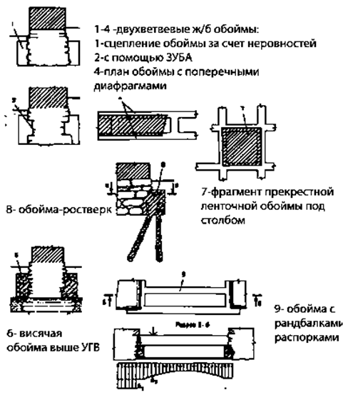 При всем различии конструкций и назначении обойм они обладают одним общим свойством – не нарушают сложившегося контакта между подошвой фундамента и основанием.