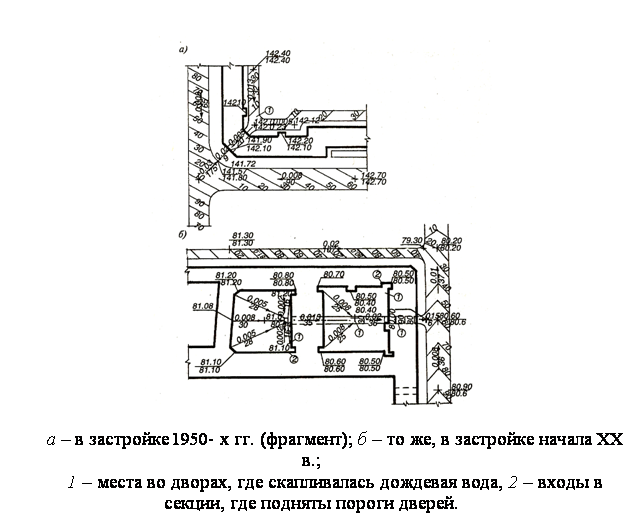 Еще один пример иллюстрирует Рис. 10.15б. В замкнутых дворах застройки начала XX в. вода стояла во многих местах. Более того, за счет подъема при ремонте «культурного слоя» она притекала к входам в лестничные клетки.