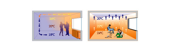 Следующий физический принцип работы теплых полов заключается в том, что наиболее теплый воздух оказывается внизу, а наиболее холодный – вверху. Распределение температур воздуха по высоте, свойственное системам «теплый пол», показано на правом рисунке. Здесь вступает в действие физиология. Дело в том, что единственная часть тела, постоянно отдающая тепло путем теплопередачи – это поверхность ступней, поэтому касание ступнями нагретой до физиологически комфортной температуры 25-28°C (большие температуры нежелательны по целому ряду причин) сразу же вызывает физиологическое ощущение комфорта, а относительно прохладный воздух на уровне головы – ощущение свежести. Практически никакой из распространенных сегодня тепловых приборов не создает уровня комфорта, сравнимого с системами «теплых полов». Выбором того или иного нагревательного кабеля можно достичь весьма высоких температур пола (до 40-50°C и даже 90-100°C), однако СНиП запрещает нагревать поверхность пола выше 26°C. К одному из достоинств, тесно связанных с физическим устройством теплых полов, является простота и дешевизна терморегулирования, или, проще говоря, поддержания одной и той же температуры в помещении. Гибкость регулирования позволяет легко приспособить режим работы полов к режиму жизни хозяев, а не наоборот. Достаточно сказать, что сегодня полы слушаются не только поворота ручки прибора, но и приказов, отданных по телефону и Интернету.
