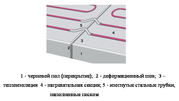 На выровненном и очищенном черновом полу укладывается теплоизоляция, затем укрепляется монтажная лента, с помощью которой закрепляют нагревательную секцию. «Холодные концы» выводят на стену для соединения с термостатом. Определяют место установки термостата, и укладывают вблизи места установки термостата между двумя нитками нагревательного кабеля гофрированную трубку для установки датчика температуры. В этот момент не помешает составить небольшой эскиз укладки, на котором показать места укладки муфт и термодатчика. Если когда-либо система будет повреждена (например, при последующем ремонте помещения), этот эскиз сослужит хозяину хорошую службу. Секция проверяется на целостность обычным тестером. После этого выполняется заливка цементно-песчаной стяжки. Толщина стяжки не может быть менее 3 см, прежде всего исходя из ее прочности и требований СНиП. Время полного затвердевания стяжки (опять же по требованию СНиП) не менее 28 суток. Лишь после этого может быть включена установленная система. Недопустимо ускорять затвердевание стяжки, включая теплый пол. Перед включением (а еще лучше на 3-5 день после заливки) необходимо проверить целостность нагревательной секции тестером. В связи с тем, что внутри осталась некоторая влага, целесообразно при первом включении прогреть стяжку не менее суток. После этого система готова к эксплуатации. При установке теплых полов в помещениях большой площади может возникнуть необходимость прохода нагревательной секции через деформационный шов. Схема прохода показана на Рис. 13.3.