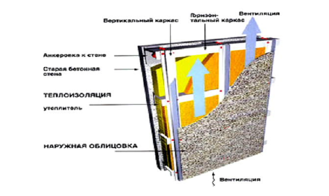 В вентилируемом фасаде отдельные слои конструкции располагаются следующим образом: