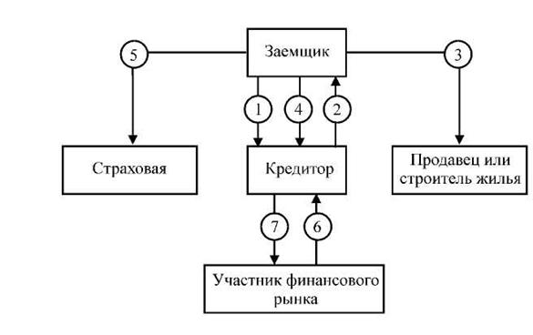 Условные обозначения: 1 — накопительный вклад; 2 — ипотечный кредит; 3 — оплата жилья по договору купли-продажи или договору подряда (собственный и заемный капитал); 4 — возврат ипотечного кредита и процентов по нему; 5 — страховая премия по договору страхования заложенного имущества; 6 — доход от продажи ценных бумаг (закладных листов); 7 — доход по ценным бумагам (закладным листам) и их погашение