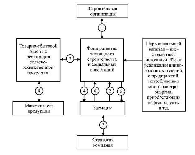 5 — предоставление жилья; 6 — погашение кредита сельскохозяйственной продукцией; 7, 8 — поступление сельскохозяйственной продукции в магазины региона