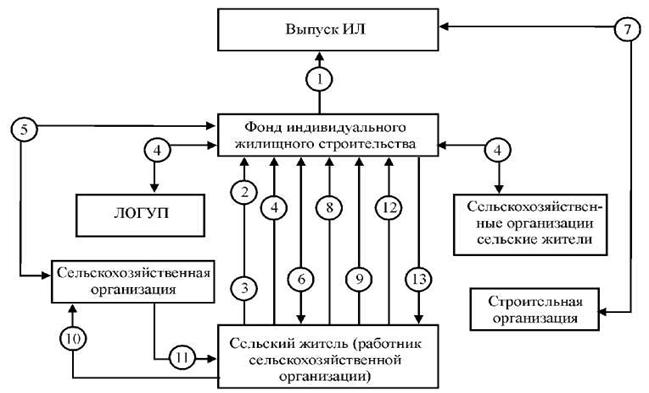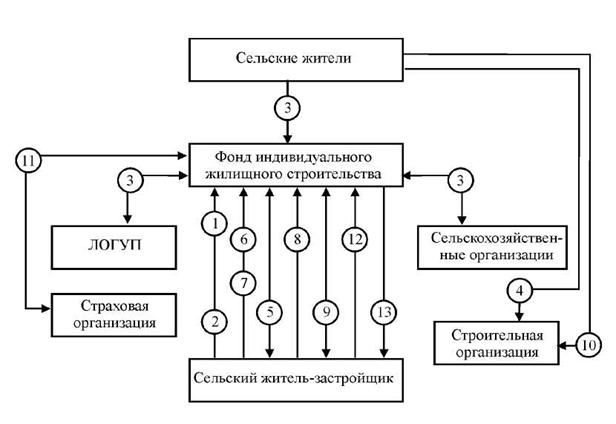 Рис. 44. Развитие ИЖС с привлечением сельскохозяйственных организаций. Условные обозначения: 1 — выпуск ИЛ Фондом; 2 — заявка; 3 — первоначальный взнос за индивидуальный жилой дом; 4 — реализация имущества, принятого в зачет взноса и погашения кредита на покупку ИЛ; 5 — продажа ИЛ сельскохозяйственной организации; 6 — оформление кредита на покупку ИЛ; 7 — финансирование строительства индивидуального жилого дома; 8 — возвращение кредита на покупку ИЛ и процентов по нему; 9 — передача Фондом ИЛ работнику сельскохозяйственной организации; 10 — возвращение средств, предоставленных сельскохозяйственной организацией своему работнику на приобретение ИЛ; 11 — передача сельскохозяйственной организацией ИЛ своему работнику; 12 — передача Фонду всех накопленных ИЛ; 13 — переход права собственности на индивидуальный жилой дом