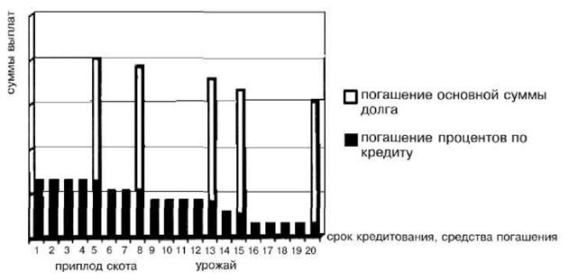 — принимается второй. К исходным условиям необходимо добавить, что сельскохозяйственной продукцией будет возвращено 50% полного годового объема платежей по погашению процентов по кредиту, 30% — семенами и 20% крупным рогатым скотом и птицей.