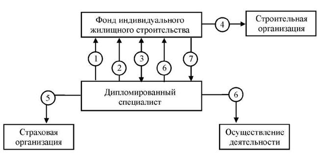 Рис. 45. Развитие ИЖС с целью привлечения квалифицированных рабочих кадров в сельскую местность. Условные обозначения: 1 — заявка; 2 — первоначальный взнос за индивидуальный жилой дом; 3 — оформление кредита на финансирование строительства индивидуального жилого дома и организацию фиксированного рабочего места; 4 — финансирование первого этапа (и последующих этапов) индивидуального дома "растущего типа"; 5 — страхование индивидуального жилого дома; 6 — осуществление профессиональной деятельности и получение прибыли; 7 — возвращение кредита на строительство индивидуального жилого дома и организацию фиксированного рабочего места