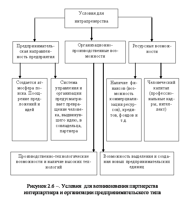 Под внутрифирменным предпринимательством понимается реализация предпринимательских целей внутри существующей коммерческой организации, выпускающей определенную продукцию (работы или услуги), в которой руководителем создаются условия для выдвижения и реализации новаторских предпринимательских идей по коммерциализации новых технических, технологических и иных достижений для чего выделяются ресурсы (интракапитал)[74] – для их реализации и оказывается всесторонняя помощь для практической реализации идеи.